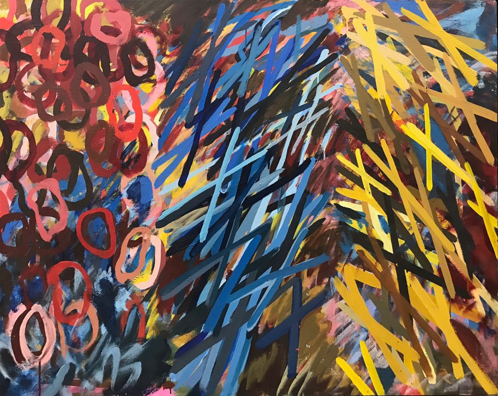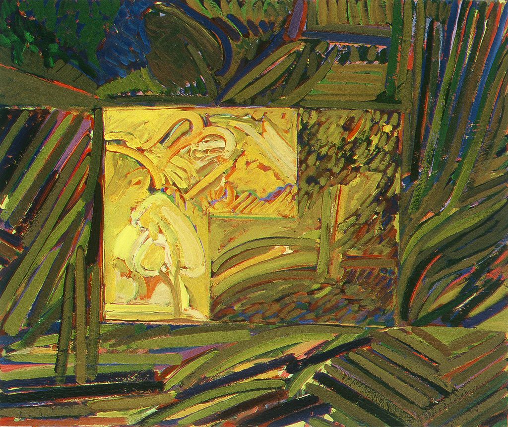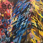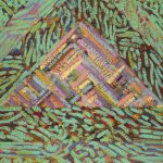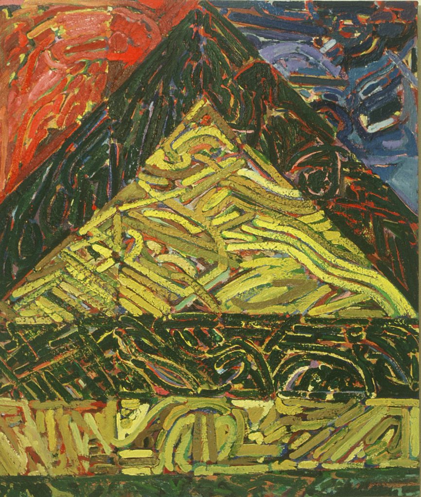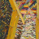 In watercolors, Showell continued his explorations with color, working out chromatic relationships in contrast to one another. Ribbons and amorphous shapes are juxtaposed or are layered in compositions reminiscent of his work from the late ’60s. Ken eventually returned to works on canvas at the end of the ’70s and into the ’80s. The softer lyrical edges of his early work had solidified into stiffer, hard-edge groupings of parallel lines. His palette resembled the color sensibility of the late ’70s and early ’80s with Ken’s uncanny ability as a colorist to harmonize each scheme. Much of this work seems to be a precursor to the eclectic approach to abstract painting in the mid ’80s.