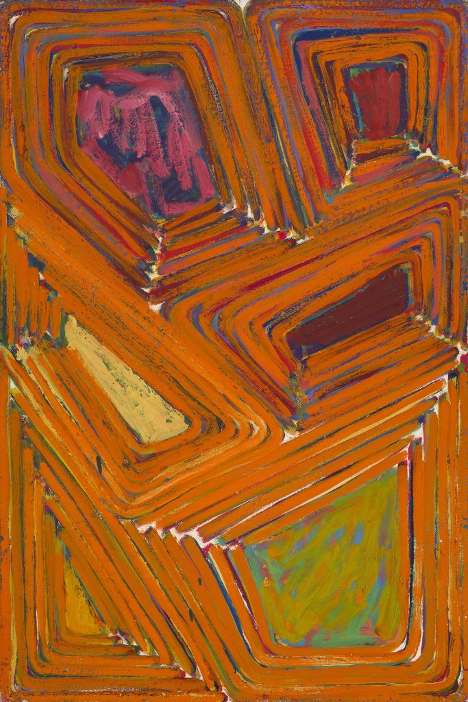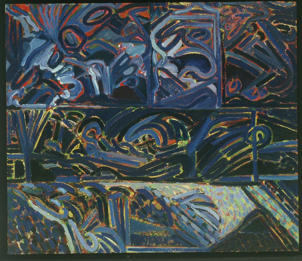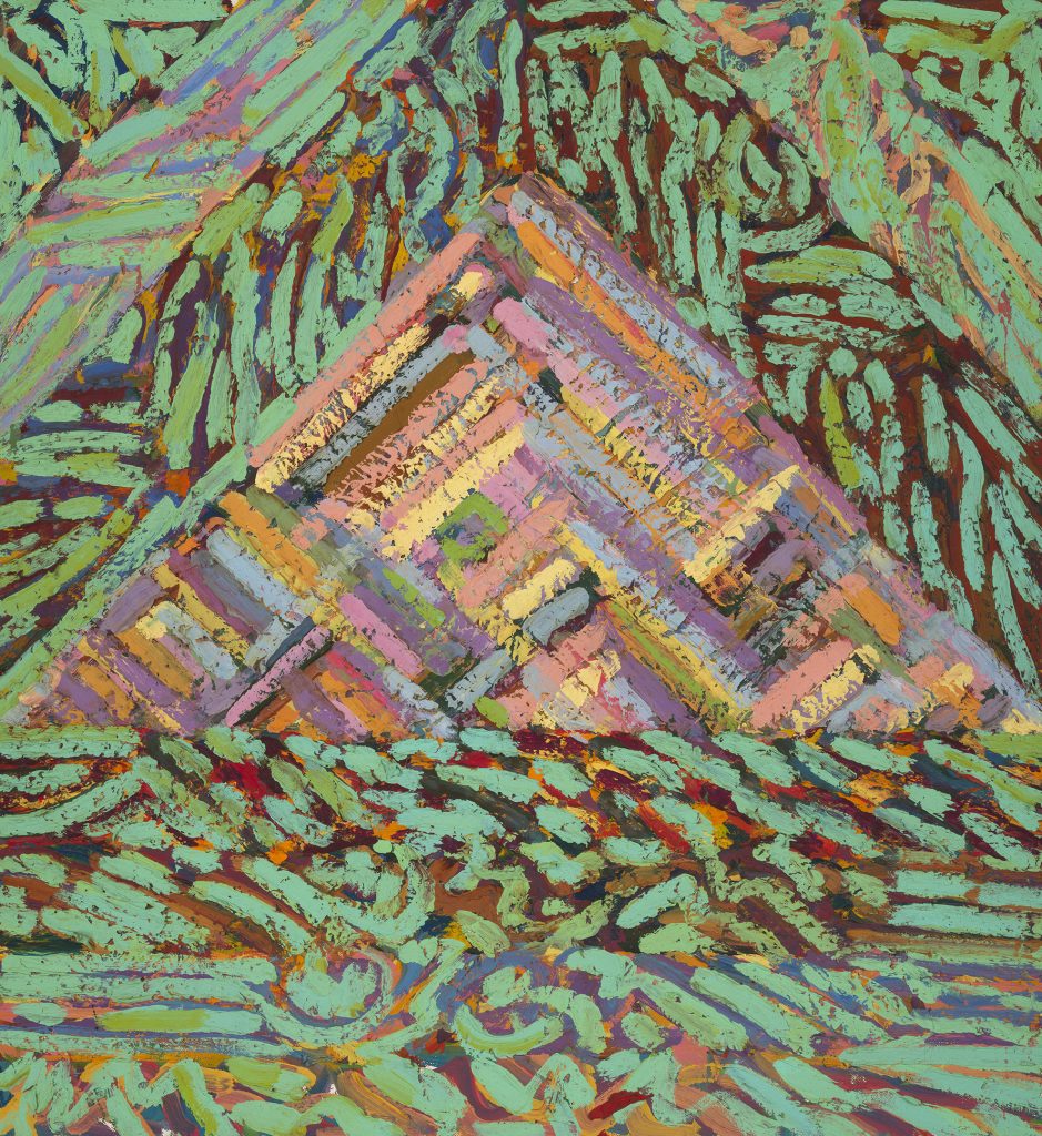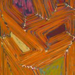 A prolific painter interested in exploration and innovation, Showell left behind the spray-painted canvas in early 1971 because, as he put it in an oral history interview, the process “quit being a surprise.” He began to explore alternative strategies and motifs. These abstract works, made in the late ’70s to early ’80s, retain his interest in color, surface, opticality, and an emphasis on process. Showell appears to have intuited the pictorial turn that abstract painting would take in the post-Modern era. Retaining his baroque aesthetic, he continues to work in a non-systemic manner, producing a series of paintings and works on paper that employ distorted grids, linear elements, and irregular overlaid geometric forms.